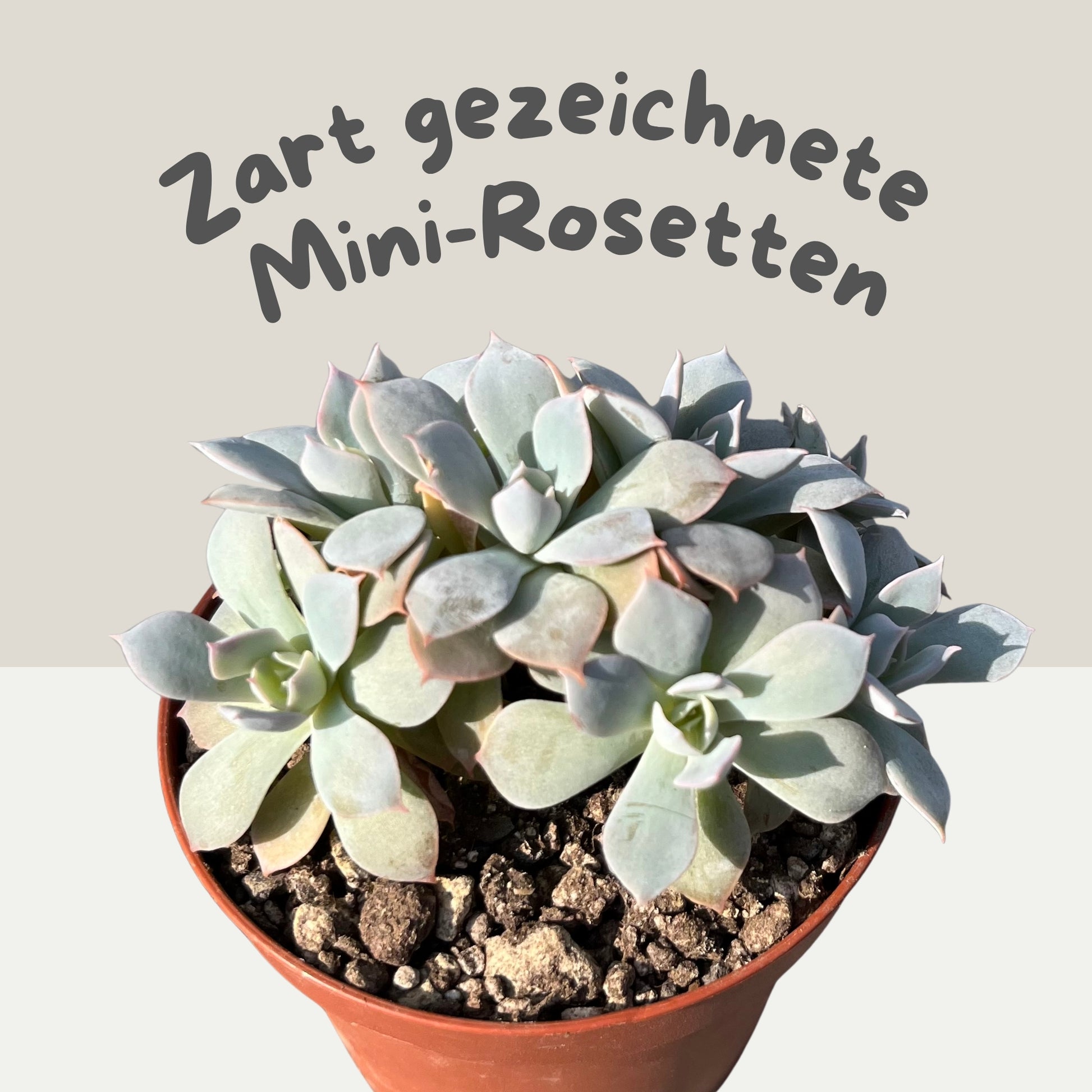 Die Echeveria derenbergii begeistert mit ihren perfekt geformten, silbrig-grünen Blattrosetten und zart rötlich gefärbten Blattspitzen. Durch ihre kompakte Wuchsform ist sie ein echter Blickfang. Im Frühjahr überrascht sie zudem mit hübschen gelb-orangenen Blüten an schlanken Stielen.